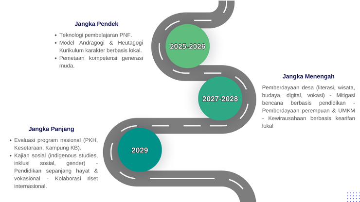 Peta Jalan Penelitian Pelaksanaan penelitian dilakukan berdasarkan peta jalan dan kelompok penelitian yang telah dijelaskan pada Buku Peta Jalan Pendidikan Program Studi S-1 Pendidikan Masyarakat .